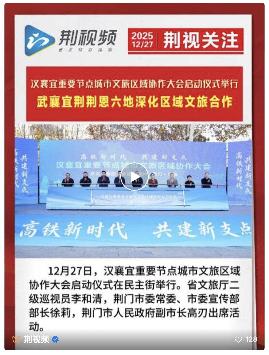 12月27日至28日,荆门市联合武汉市、襄阳市、宜昌市、荆州市、恩施市联合举办汉湘宜重大节点城市文化旅游区域合作会议。文化和旅游六部门负责人共同签署《荆门区域文化和旅游合作协议》。本次会议上,来自全国各地的景区和旅游企业就文化旅游产业发展进行了密切的交流和探讨。